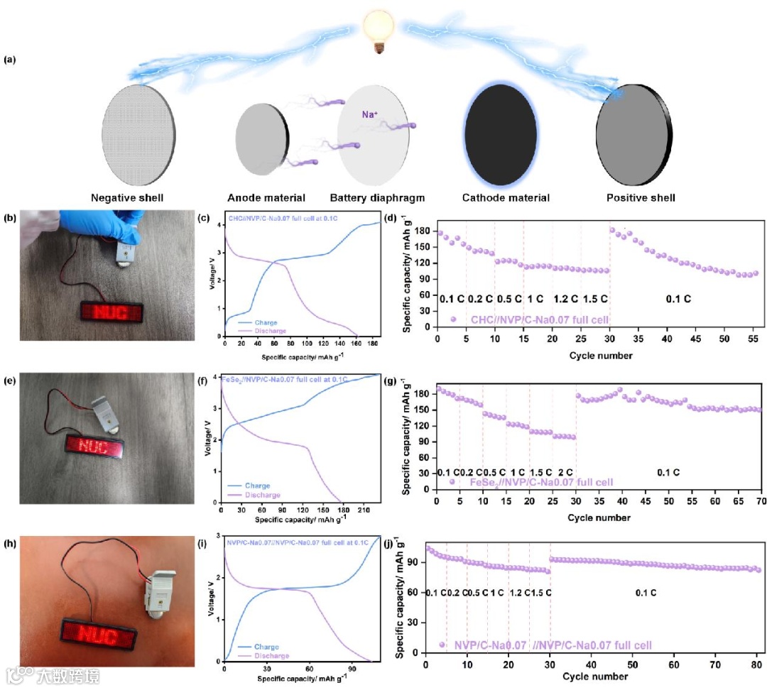 图4 (a)钠离子全电池示意图。(b-j)用CHC、FeSe2和NVP/C-Na0.07作为阳极组装的全电池点亮LED灯面板的照片,以及它们在0.1C、倍率和循环性能曲线下的GCD曲线。