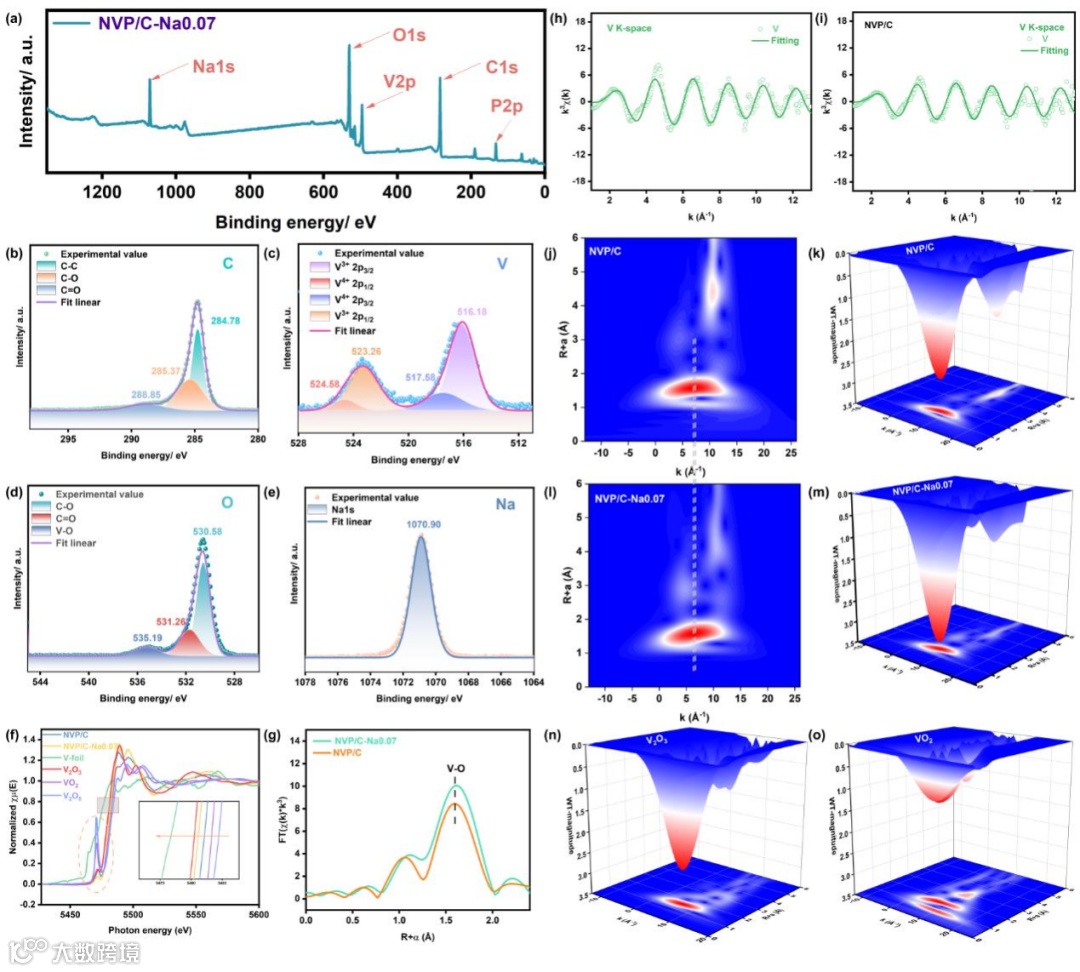 图2(a-e)NVP/C-Na0.07的XPS总谱和XPS其他元素(C、V、O、Na)的高分辨率分析。(f)V的K边XANES谱。(g)NVP/C和NVP/C-Na0.07的EXAFS谱图。(h-j)NVP/C和NVP/C-Na0.07的k空间拟合。(j-o)NVP/C、NVP/C-Na0.07、V2O3和VO2的小波变换。