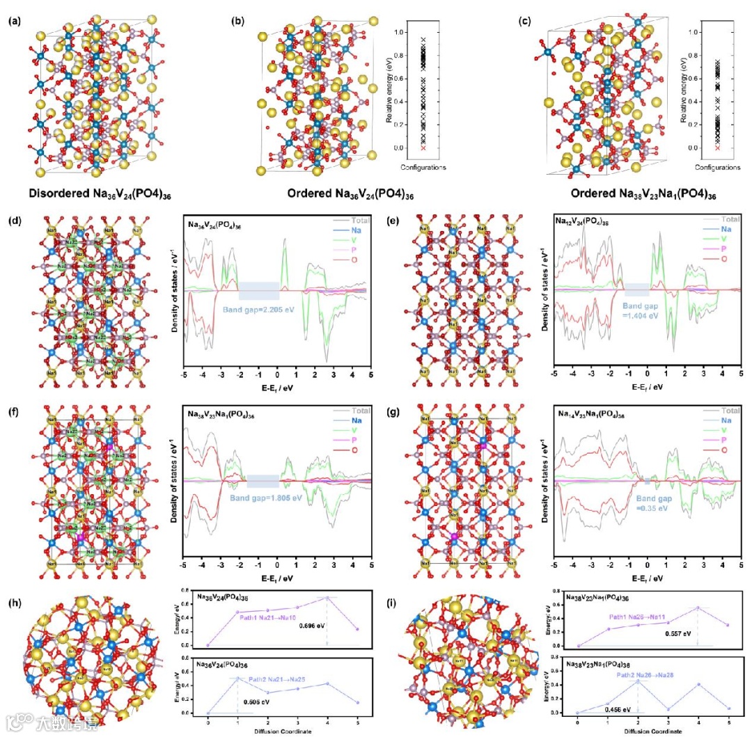 图3 (a)无序NVP、有序NVP和有序改性NVP(NVP/CNa0.07)的晶胞结构。(d-e)NVP在初始状态和脱钠状态下的态密度。(f-g)改性NVP在初始状态和脱钠状态下的态密度。(h-i)原始和改性NVP的两条迁移路径及其相应的迁移势能。