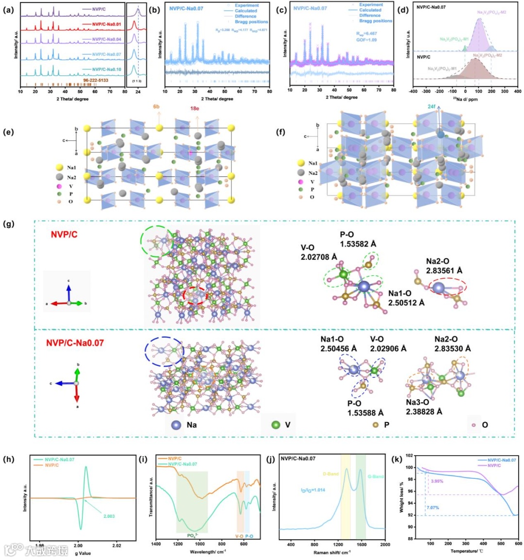 图1 (a)五份样品的比较XRD图。(b) XRD NVP/C-Na0.07的精修光谱。13(c)NVP/C-Na0.07的占位精修。(d)NVP/C和NVP/C-Na0.07中钠元素的固态核磁共振(NMR)拟合。(e)NVP/C的结构可视化。(f)NVP/C-Na0.07的结构可视化。(g)使用VESTA软件获得NVP/C和NVP/C-Na0.07的球棍模型及化学键的NVP/C-Na0.07结构可视化。