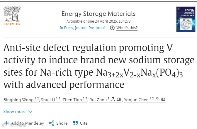 中北大学陈彦俊、周瑞Energy Storage Materials观点:反位缺陷调控提高V活性诱导富钠型Na3+2xV2-xNax(PO4)3生成全新储钠位点