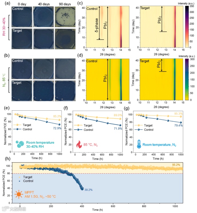 图5.在(a) 潮湿环境(30-40%相对湿度,室温)和(b) 热老化条件下(氮气,85℃),对照组和目标钙钛矿薄膜的形态变化。在(c) 潮湿环境(30-40%相对湿度,室温)和(d) 热老化条件下(氮气,85℃),对照组和目标未封装钙钛矿太阳能电池的X射线衍射演变模式。在(e) 潮湿环境(30-40%相对湿度,室温)、(f) 热老化条件下(氮气,85℃)和(g) 氮气老化条件下(室温),对照组和目标未封装钙钛矿太阳能电池的长期稳定性。(h) 未封装钙钛矿太阳能电池在氮气环境中连续单日光照下的最大光转换效率。