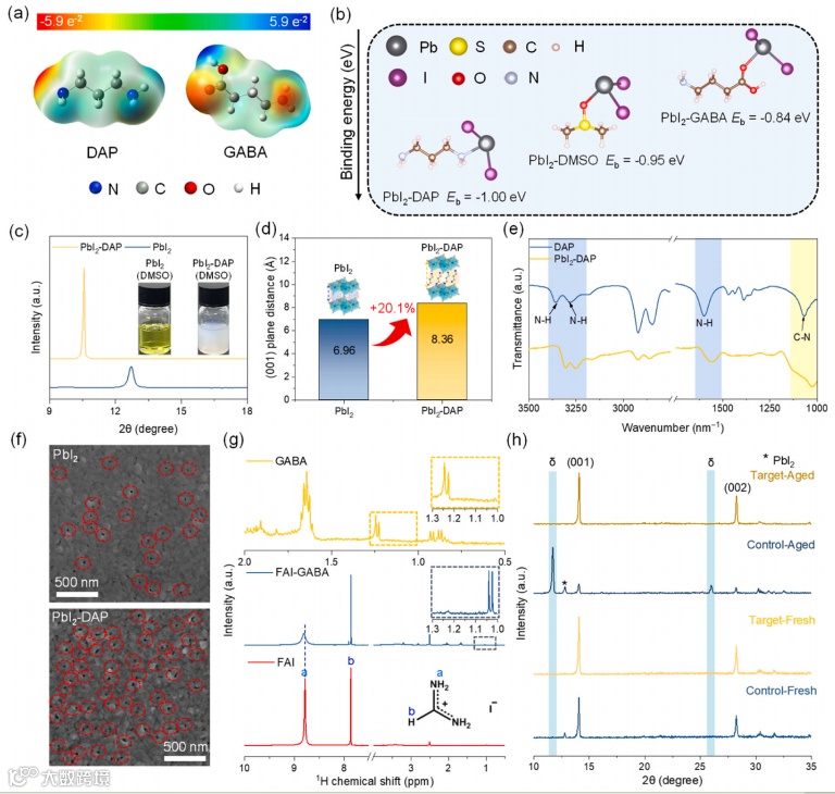 图1. (a) DAP、GABA的分子结构及高斯计算的静电势。(b) PbI2-DAP、PbI2-DMSO和PbI2-GABA分子间相互作用的示意图。(c) PbI2和PbI2-DAP薄膜的XRD。插图展示了纯碘化铅和PbI2-DAP DMSO溶液的照片,其中碘化铅与DAP的摩尔比为1: 1。(d) 从图1c的XRD结果中得出的纯PbI2和PbI2-DAP的晶格间距。(e) DAP和PbI2-DAP薄膜的FTIR光谱。(f) 纯PbI2和PbI2-DAP薄膜的SEM图像。(g) GABA、FAI-GABA和FAI粉末的1H-NMR图谱。(h) 从新鲜和老化有机阳离子溶液制备的钙钛矿薄膜的XRD,这些溶液在N2中于25 ± 5◦C下储存30天,有的含有GABA,有的不含。