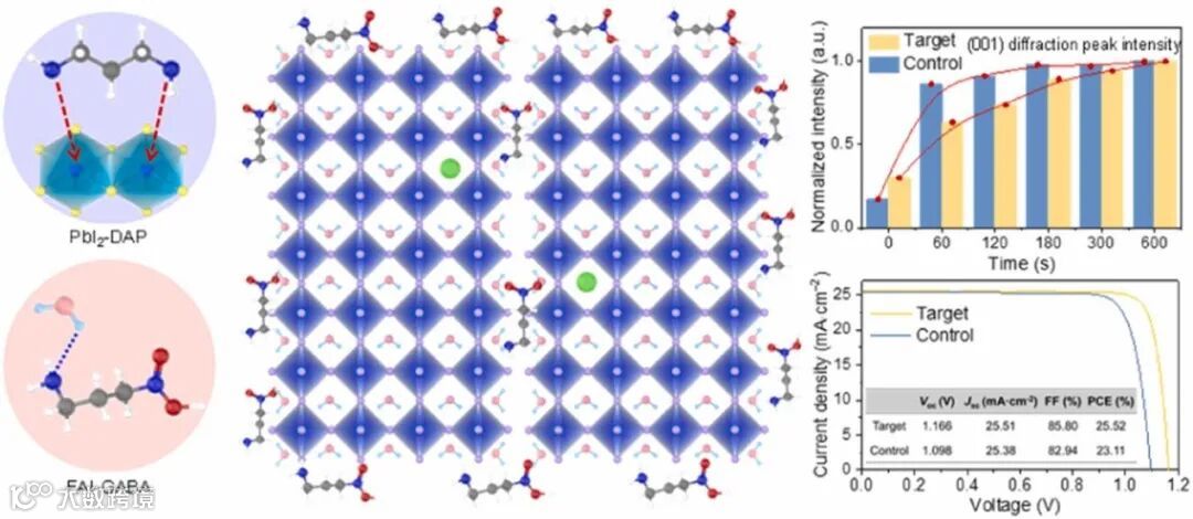 从静电势分布和DFT理论计算结果可以看出双分子与PbI2和FAI的结合方式,计算结果表明DAP与PbI2bI2的结合力最强。同时XRD结果也表明DAP与PbI2结合形成了新的中间体,据此计算得到的晶格间距以及SEM图像都说明PbI2-DAP薄膜中形成了介孔结构,挥发性的DAP作为PbI2的中间体,阻止了DMSO-PbI2中PbI2的密集生长,同时降低了传统PbI2配位复合物解离的能量消耗,这有利于FA+的稳定插入,并触发了α-FAPbI3形成的独特动力学行为。