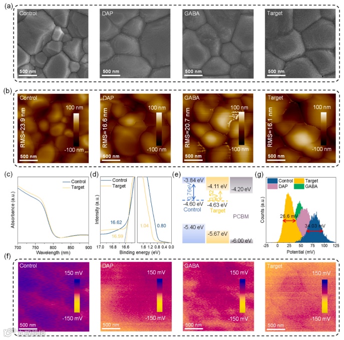 图3. (a) 控制组、DAP、GABA和目标钙钛矿薄膜的顶部SEM图像。(b) 控制组、DAP、GABA和目标钙钛矿薄膜的AFM图像。(c) 控制组和目标钙钛矿薄膜顶面的UV-Vis吸收光谱。(d) 控制组和目标钙钛矿薄膜顶面的UPS表征。(e) 基于控制组和目标钙钛矿顶界面的能量带图。(f) 控制组、DAP、GABA和目标钙钛矿薄膜的KPFM图像。(g) KPFM测量对应的表面电位分布。