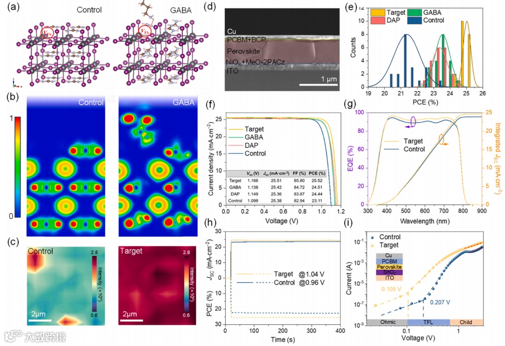 图4. (a-b) 钙钛矿在无GABA配位和有GABA配位条件下的VFA表面缺陷模型及电子局域函数(ELF)模式。(c) 控制组与目标钙钛矿薄膜在玻璃基板上的光致发光强度分布图。(d) 目标PSC结构的截面扫描电子显微镜图像。(e) 20个单元格的PCE分布直方图。(f) 在反向(1.2 V→0 V)方向下,掩模定义面积为0.0324平方厘米时,控制组、DAP、GABA和目标钙钛矿太阳能电池的J-V曲线。(g) 控制组与目标钙钛矿太阳能电池的EQE光谱。(h) 控制组与目标钙钛矿太阳能电池在最大功率点测得的稳态光电流和稳定功率输出。(i) 基于控制组和目标钙钛矿的仅电子结构器件的SCLC曲线。