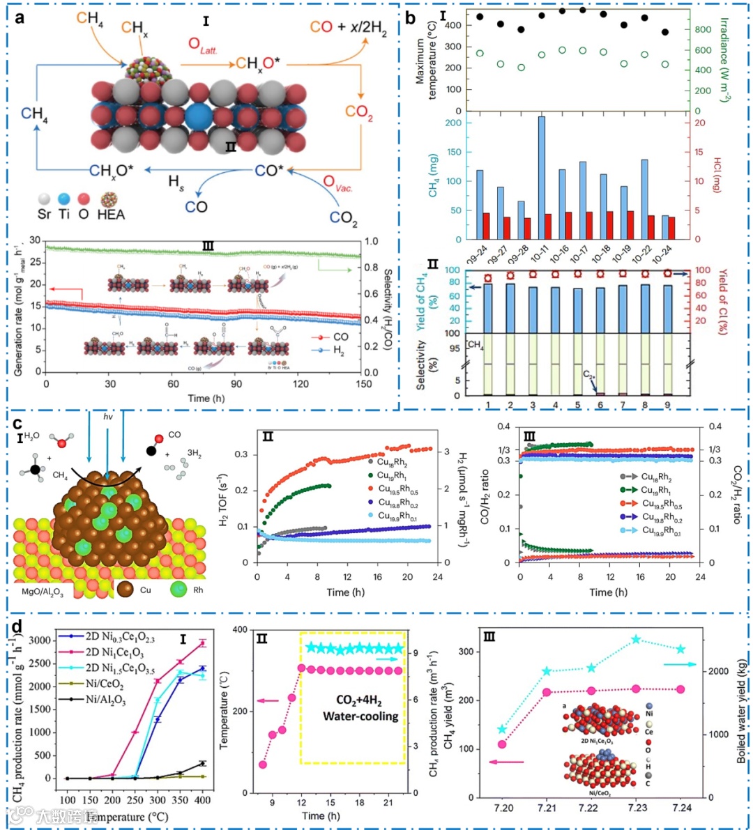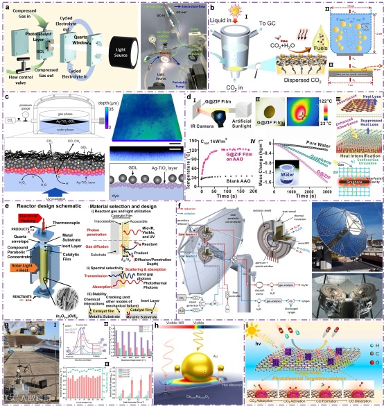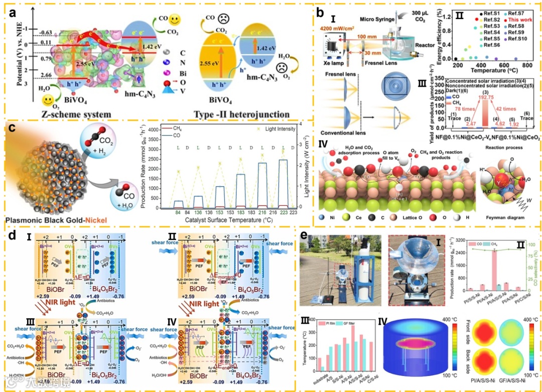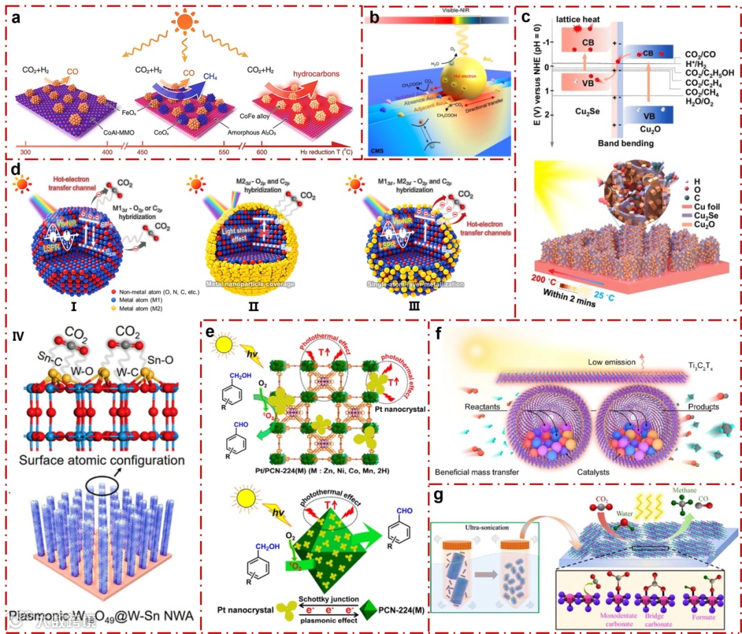 图1. (a)光催化CO2还原;(b)热辅助光催化CO2还原;(c)热电子和表面黑金等离子体共振协同促进光催化CO2还原;(d)通过局部极化电场促进光催化CO2还原;(e)光热催化CO2还原。