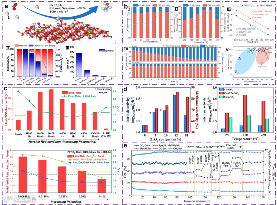 图5. (a)通过构建具有Lewis酸碱配对位点的金属氧化物活性位点催化剂,促进热催化CO2还原;(b)通过共浸渍方法制造金属沸石催化剂,促进热催化CO2还原;(c)通过构建支持单原子催化剂促进热催化CO2还原;(d)通过设计的多组分支持-多组分单原子催化剂系统促进热催化CO2还原;(e)通过建立金属-硫化物界面构型促进热催化CO2还原。