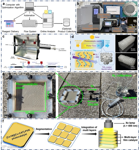 图7. 实验室规模连续流反应器 (a)微反应器工作原理示意图;(b)多点进气的连续流反应器;(c)管式反应器;(d) 3D打印反应器;(e)平板反应器;(f)膜反应器。