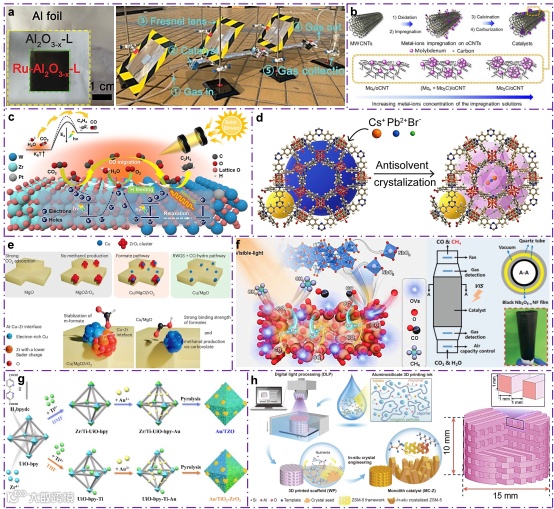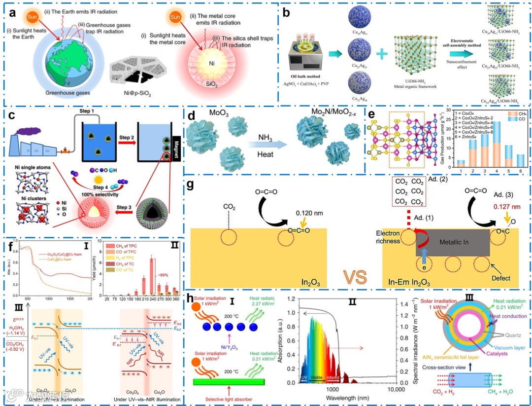 图6. (a)通过核壳结构提高光热转换效率,促进光热催化CO2还原;(b)通过优化核-壳结构中的界面环境来提高产品选择性;(c)通过改进核壳催化剂的合成方案促进光热CO2还原;(d)通过异质结界面工程促进光热催化CO2还原;(e)通过精确调整多组分催化剂比例来提高光热催化性能;(f)通过选择有利的支撑材料促进催化剂制造工艺;(g)通过缺陷工程策略促进CO2吸附/活化位点;(h)通过表面改性技术提高光吸收能力。