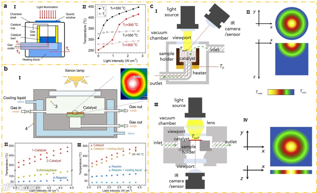 图2. (a)利用热电偶监测液固催化系统的温度;(b)通过热电偶和红外热成像检测气固催化系统的温度;(c)通过热电偶和红外热成像检测气固催化系统的温度。