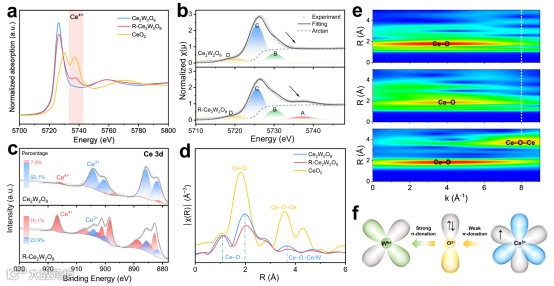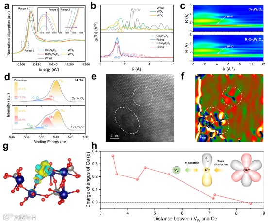 X射线吸收精细结构(XAS)和X射线光电子能谱(XPS)剖析了OER前后Ce原子的电子态和局域成键环境变化。结果表明,经过表面重构后,Ce的平均价态升高,同时Ce-O配位环境的结构无序度增大。这些变化共同指向了通过Ce-O-W桥链中发生的从Ce到W的电子转移现象,揭示了表面重构对Ce电子结构的影响。