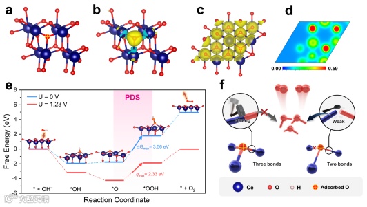 本工作首先用理论计算揭示了本征CeO2的OER活性较差的根本原因。分析表明,*O等中间体与CeO2(111)表面的多个Ce原子形成了过强的、以离子键为主的吸附作用,这导致了后续决速步骤(*OOH形成)的能垒极高,严重阻碍了OER动力学。