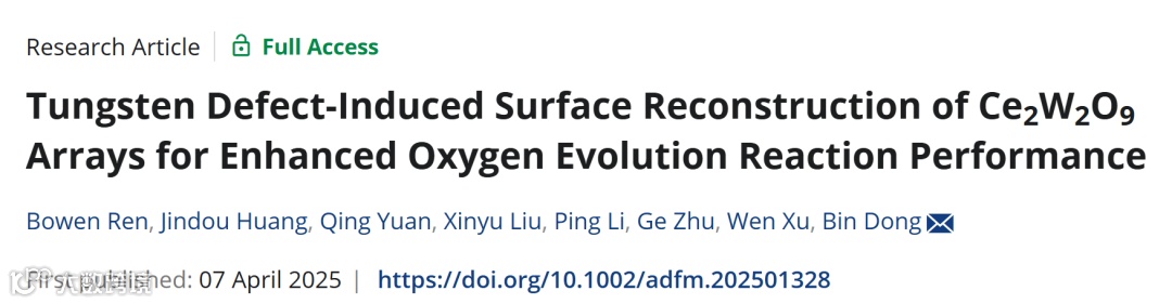 基于此,大连民族大学董斌教授、任博文、黄金斗等人,在国际知名期刊Advanced Functional Materials上发表题为“Tungsten Defect-Induced Surface Reconstruction of Ce2W2O9 Arrays for Enhanced Oxygen Evolution Reaction Performance”的研究论文。该论文证实了在电化学表面重构过程中形成的钨缺陷有效改变了Ce原子的局部键合环境。重构后的钨酸铈电极活性相较于传统氧化铈材料有大幅提高。