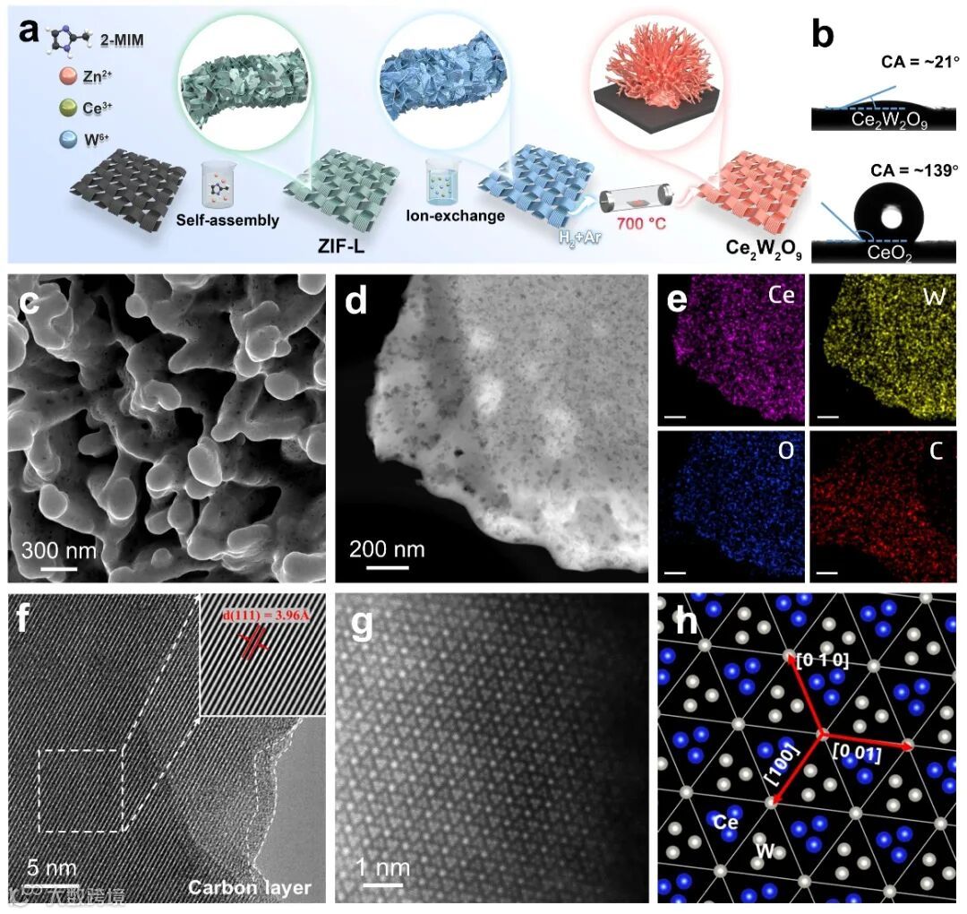 本工作通过模板法、离子交换和煅烧,成功在碳布上合成了具有多孔珊瑚状形貌的钨酸铈阵列,其表面还包覆有一层薄的碳层。这种独特的结构赋予了材料优异的亲水性(接触角显著降低),有利于后续的电催化应用。球差电镜图(2g)清晰的展示了W原子和Ce原子整齐排列,表明结晶性良好。