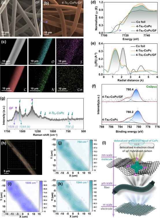图2. 单分子集成催化电极的表征(以4-Ts2-CoPc/GF为例)。