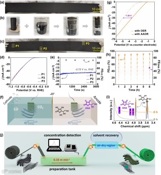 值得一提的是,该方法仅需3分钟即可完成米级单分子集成催化电极的一体化构筑(图3),有望在未来结合数控连续生产系统实现单分子集成催化电极的规模制备。此外,我们还考察了酞菁种类、碳纤维种类、评估系统等因素,证实了该方法的普适性,夯实了形成产线技术的实验基础。以噻吩功能化的4-Ts2-CoPc/GF为例,其在电催化CO2还原中显示出有良好的性能一致性和高的TOF值(在−1.07 V 的电位下达137,600 h−1)。针对阳极缓慢的析氧反应(OER),该单分子集成催化电极(4-Ts2-CoPc/GF)可进一步耦合抗坏血酸氧化反应(AAOR),在阳极同步生成医用原料脱氢抗坏血酸(DHA),为具有“高电子经济效益”的电催化系统设计提供了科学参考。