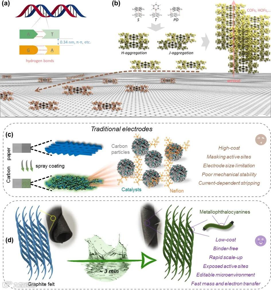 针对传统粉末状催化剂在工作电极制备中面临的繁琐涂覆、粘结剂依赖、尺寸受限(厘米级)等挑战。本团队受自然界中非共价键组装的启发,利用π-π异质堆积相互作用,将平面大共轭的酞菁分子以单分子形式直接锚定在高石墨化的柔性石墨毡(GF)表面。该制备方法兼具低成本与规模化生产优势,所制得的催化电极具有以下显著特点:1)独特的无粘结剂结构设计,有效避免了传统电极中粘结剂对活性位点的覆盖;2)三维开放结构确保活性位点充分暴露;3)微环境可精准调控,可根据不同反应体系需求进行优化设计;4)具有优异的传质与电荷传输性能,大幅提升了电极的反应动力学特性(图1)。通过一系列光谱和电镜技术证实了该单分子集成催化电极的微观结构和宏观形貌(图2),为其电催化应用奠定了材料基础。