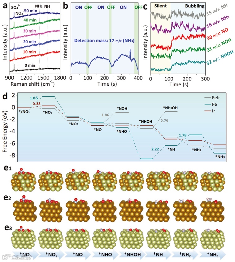 为阐明FeIr合金催化剂的硝酸盐还原反应(NITRR)反应路径,进行了一系列原位测试。在拉曼光谱中,977 cm−1和1045 cm−1处的峰分别归属于SO₄²⁻和NO₃⁻。随着反应的进行,SO₄²⁻的峰强保持稳定,而NO₃⁻的峰强逐渐减弱,表明NO₃⁻在催化剂表面持续消耗。此外,在反应进行40-50分钟后,出现了与NH和NH₂相关的两个峰,表明这些中间体的形成。结合原位差分电化学质谱(DEMS)技术,进一步证实了NITRR过程中生成了NH、NH₂、NH₃、NO、NHO和NHOH等中间体和产物,可能存在“NHO或NOH路径”。DFT计算表明,FeIr合金能够显著增强硝酸盐的吸附,调控*H的生成,从而促进NITRR过程。