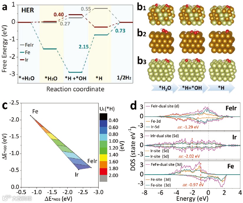 图5. (a, b)HER的吉布斯自由能计算。(c)H2O和NO3-在催化剂表面的吸附能对比。(d)不同催化剂的DOS图。