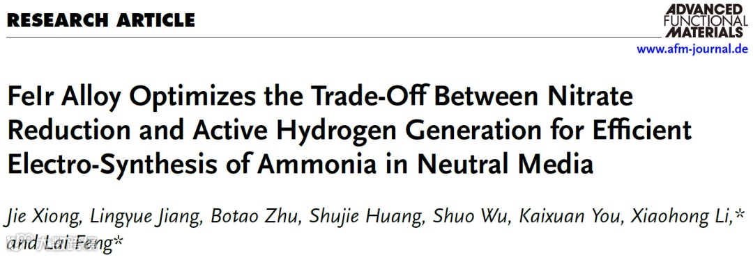 FeIr合金优化硝酸盐还原与活性氢生成的平衡实现中性电解液中氨的高效电催化合成。