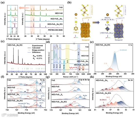 图1. (a) FeS、HED-FeS、HED-FeS1-xSex和HED-FeS1-xSex/EG的XRD谱图。(b) FeS和HED-FeS1-xSex/EG的晶体结构变化示意图。(c) Rietveld 精修XRD谱图。(d) 拉曼谱图。(e) C 1s精细谱图。(f) Fe 2p精细谱图。(g) S 2p & Se 3p精细谱图。(h) Se 3d精细谱图。