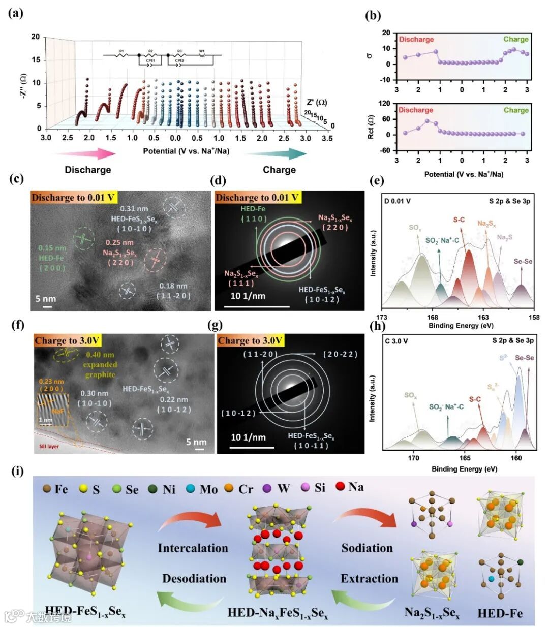 图5.(a)HED-FeS1-xSex/EG电极首次循环原位EIS在不同充放电状态下的奈奎斯特图。(b) 对应的Rct拟合结果和阻抗谱在低频部分的拟合斜率σ。(c-e) HED-FeS1-xSex/EG电极在完全放电至0.01 V状态下的HRTEM图像、SAED图像和S 2p精细谱图。(f-h) HED-FeS1-xSex/EG电极在完全充电至3.0 V状态下的HRTEM图像、SAED图像和S 2p精细谱图。(i) HED-FeS1-xSex在充电/放电过程中的晶体结构转变示意图。