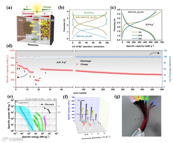 图6.(a)Na3V2(PO4)3//HED-FeS1-xSex/EG全电池示意图。(b) 半电池和全电池的GCD曲线图。(c) 全电池在0.5 A g-1下前3次循环的GCD曲线图。(d) 0.5 A g-1到5 A g-1的倍率性能,接1 A g-1的循环测试图。(e) 该全电池和其他储能器件的Ragone图。(f)与其它铁基硫化物负极材料在全电池应用的循环性能比较图。(g)全电池用于点亮LED灯的照片。