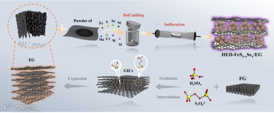 示意图 鳞片石墨向膨胀石墨的转变及高熵掺杂HED-FeS1-xSex/EG负极材料的制备