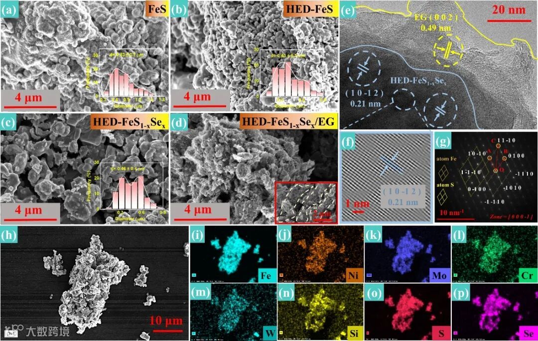 图2.(a-d)FeS、HED-FeS、HED-FeS1-xSex和HED-FeS1-xSex/EG的场发射扫描电子显微镜(SEM)图与相应的粒径分布图。(e) HED-FeS1-xSex/EG的高分辨率透射电子显微镜图像。(f) 局部对应的反向FFT图像。(g) HED-FeS1-xSex/EG的选区电子衍射图像。(h-p) HED-FeS1-xSex/EG的能量色散x射线光谱(EDS)图。