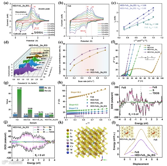 图4.(a)HED-FeS1-xSex/EG在不同扫描速率下的CV曲线。(b) FeS在不同扫描速率下的CV曲线。(c) 峰值电流Ip与扫描速率开方v1/2的关系。(d) HED-FeS1-xSex/EG在不同扫描速率下的电容贡献率。(e) FeS和HED-FeS1-xSex/EG在不同扫描速率下的电容贡献率对比图。(f) FeS、HED-FeS、HED-FeS1-xSex和HED-FeS1-xSex/EG的奈奎斯特图。(g) 四种电极材料的Rs和Rct对比图。(h) 奈奎斯特图低频区Z′与ω-1/2的线性拟合关系图。(i) FeS的电子总态密度TDOS和分波态密度PDOS。(j) HED-FeS1-xSex/EG的电子总态密度TDOS和分波态密度PDOS。(k) HED-FeS1-xSex/EG的晶体模型构建。(l) FeS和HED-FeS1-xSex/EG的Na+迁移势垒及相应的迁移路径模型。