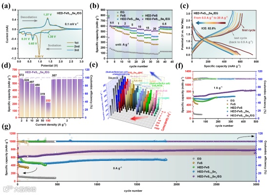 图3.(a)扫描速率为0.1 mV s-1时, HED-FeS1-xSex/EG的前三条循环伏安曲线图。(b) HED-FeS1-xSex/EG的倍率性能图。(c) HED-FeS1-xSex/EG随不同电流密度变化的充放电曲线图。(d) HED-FeS1-xSex/EG在高电流密度下的倍率性能图。(e) HED-FeS1-xSex/EG与其他同类负极材料的半电池性能对比图。(f) HED-FeS1-xSex/EG在1 A g-1下的循环性能图。(g)HED-FeS1-xSex/EG在5 A g-1下的循环性能图。