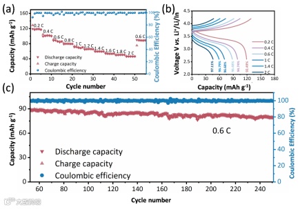 因此,基于此组装的Li/In/Li6PS5Cl/LYCCB-12.5/LYCCB-12.5+LCO全固态电池在2.6-4.2V的电压下从0.2C增大至2C的倍率下稳定循环,且重新以0.6C的倍率循环电池没有明显的容量衰减,在稳定循环200圈后其容量保持率为90%。