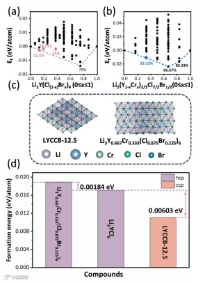 基于第一性原理计算,在原始相Li2YCl4的Y位和Cl位掺杂Cr和Br并通过Alloy-Theoretic Automated Toolkit(ATAT)搜索出最佳掺杂比例,得到具有立方密排结构LYCCB-12.5。同时,经过形成能计算,具有立方密排结构LYCCB-12.5的形成能远低于Li3YCl6,导致体系具有向立方密排结构转变的能量倾向,实现结构从六方密排结构转变为立方密排结构。
