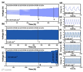 组装的In/LCO+LYCCB-12.5/LYCCB-12.5/LYCCB-12.5+LCO/In对称电池(LCO的负载量16.4 mg cm-2)在0.1 mA cm-2(0.05 C)至1.8mA cm-2(0.9 C)的电流密度下可以稳定循环1100小时以上,表明LYCCB-12.5与LCO界面具有优异的电化学稳定性