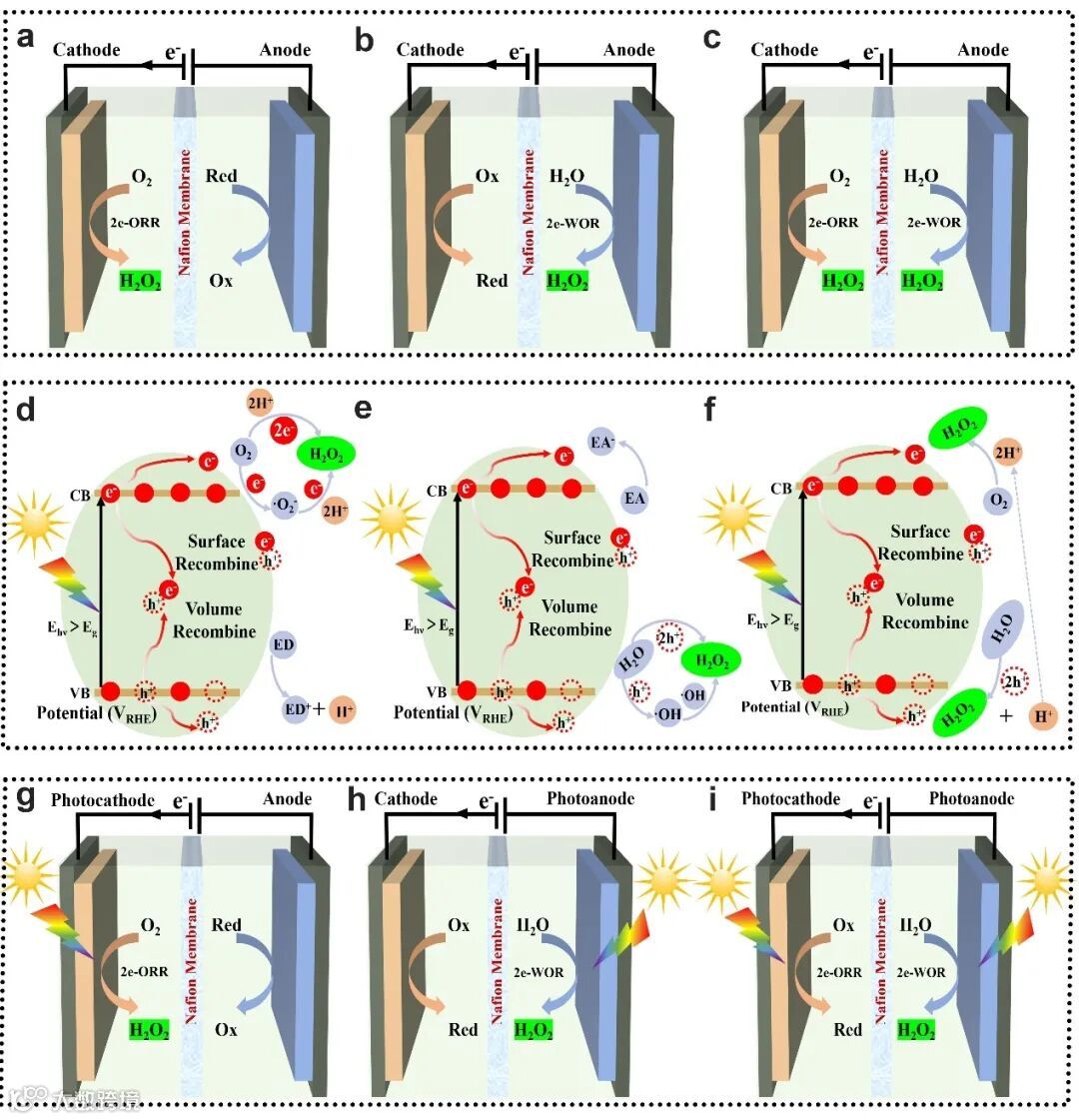 图2不同系统H2O2生产机理示意图:电化学H2O2生产:a) 2e−ORR b)2e−WOR和c) 双通道途径。光化学H2O2生产:d) 2e−ORR e) 2e−WOR和f) 双通道途径 光电化学H2O2生产:g) 2e−ORR, h) 2e−WOR和i) 双通道途径。