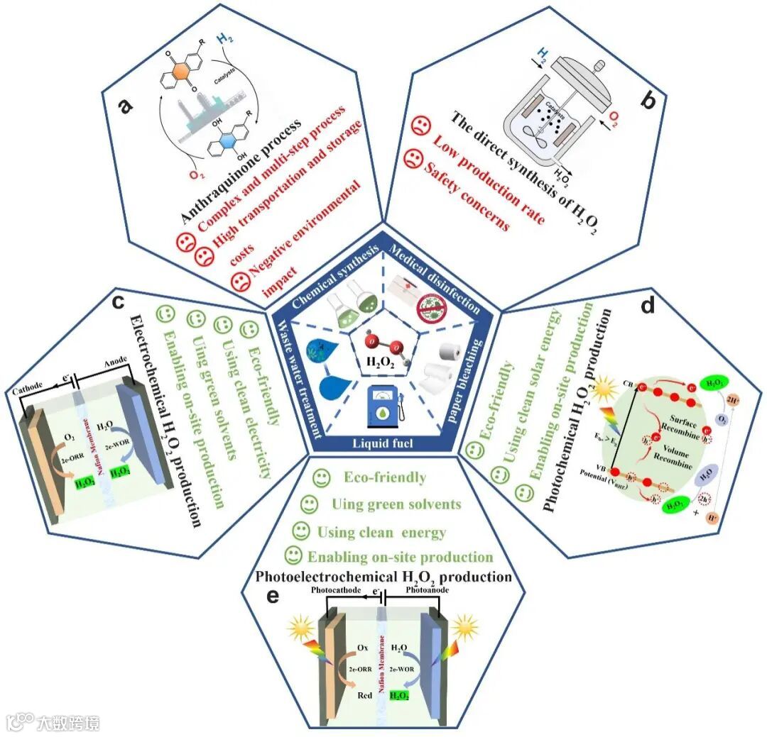 过氧化氢(H2O2)是一种环保高效的氧化剂,广泛应用于化工、医药、能源和环保等领域。传统的合成方法,如蒽醌氧化法,消耗资源大且对环境有害。由氢气和氧气直接合成H2O2的过程受限于安全性、效率和重金属催化剂污染之间的平衡。为了解决这些问题,电化学、光化学和光电化学等替代方法应运而生,提供了更绿色、可持续的解决方案。这些创新方法仅依赖于水、氧气和太阳能或电能,有望成为耗能密集的蒽醌工艺的可行替代。