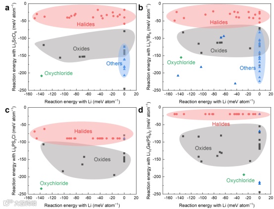 图5. DSHTS框架这其他SSE上的应用。a. Li3ScCl6, b. Li3YBr6, c. Li6PS5Cl 和 d. Li10Ge(PS6)2 的筛选结果。筛选出的材料分为氧化物(黑色)、卤化物(红色)、氧氯化物(绿色)和其他材料(蓝色)。