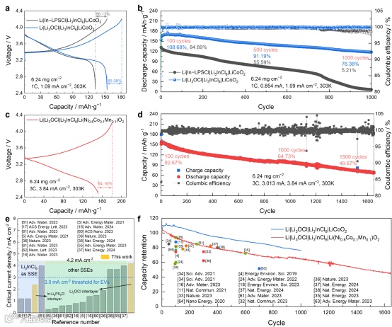 图4. 303 K下ASSLMBs的电化学性能评估。a. Li|In-Li₆PS₅Cl|Li₃InCl₆|LiCoO₂和Li|Li₃OCl|Li₃InCl₆|LiCoO₂电池在1 C倍率(1.1 mA/cm²)下的初始充放电曲线对比。b. 两种电池结构在1 C倍率下1000次循环的循环稳定性和库仑效率。c. Li|Li₃OCl|Li₃InCl₆|Li(Ni₀.₈Co₀.₁Mn₀.₁)O₂电池在3 C倍率(3.8 mA/cm²)下的首次循环电压曲线。d. 基于Li|Li₃OCl|Li₃InCl₆|Li(Ni₀.₈Co₀.₁Mn₀.₁)O₂的电池在3 C倍率下1500次循环的长期循环性能和库仑效率。e. 临界电流密度与其他ASSLMB系统的对比。 f. 全电池循环稳定性与其他ASSLMB系统的对比。