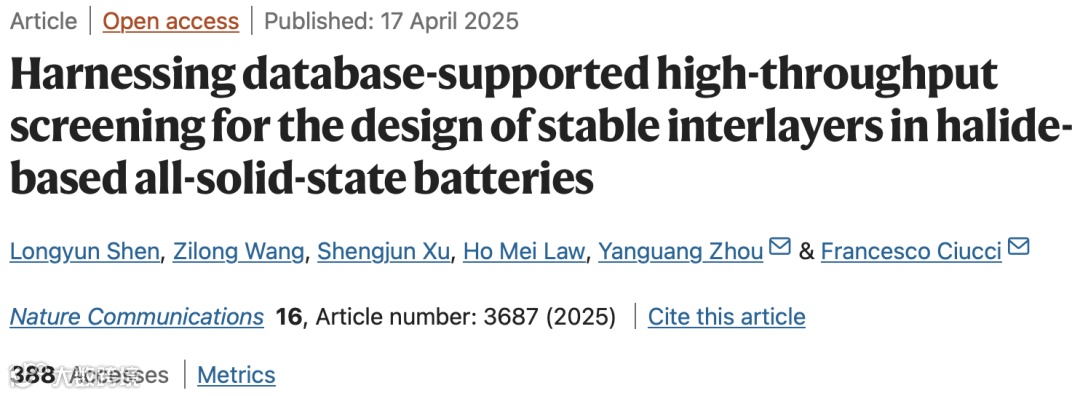 Longyun Shen, Zilong Wang, Shengjun Xu, Ho Mei Law, Yanguang Zhou & Francesco Ciucci. Harnessing database-supported high-throughput screening for the design of stable interlayers in halide-based all-solid-state batteries. 2025, 16: 3687.