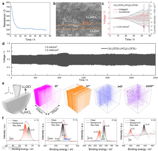 图3. Li₃OCl与Li/Li₃InCl₆的电化学及界面特性。a. Li|Li₃OCl|Li₃InCl₆|Li₃OCl|Li对称电池界面电阻的时间依赖性演变。b. 运行72小时后的Li₃OCl|Li₃InCl₆界面的横截面扫描电子显微镜图像。c.临界电流密度测试。d. 对称电池在1 mA/cm²下,容量为1 mAh/cm²的长循环性能。e. ToF-SIMS分析显示溅射几何形状(左)和Li₃InCl₆|Li₃OCl|Li界面处O²⁻、In³⁺、InO⁺和LiInO₂⁺的三维离子分布图(溅射参数:1000秒,250×250 μm²区域)。f. 循环后的Li₃OCl|Li₃InCl₆界面的高分辨率XPS核心能级谱(Li 1s、O 1s、Cl 2p和In 3d),相对峰强度由刻度条表示。