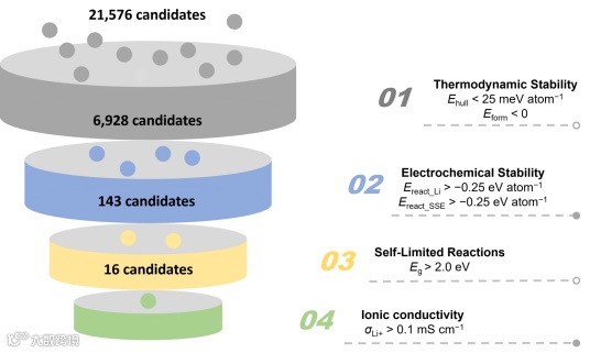 本文提出的高通量筛选框架包括四个筛选步骤,以确定潜在的层间材料。灰色、蓝色、黄色和绿色部分分别代表对热力学稳定性、电化学稳定性、自限制反应行为和离子导电性的筛选。