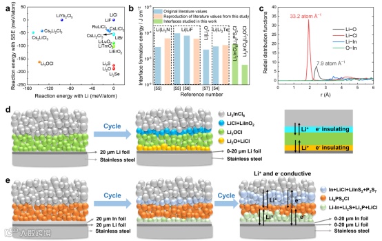 图 2. 锂和 Li3InCl6 夹层材料的界面稳定性和反应分析。a. 筛选出的 16 种材料与锂负极和 Li3InCl6 的反应能。b. Li3OCl (100)|Li3InCl6 (100) 和 Li6PS5Cl (100)|Li3InCl6 (100) 界面与其他界面的界面形成能比较。c. Li3OCl (100)|Li3InCl6 (100) 界面上的 Li-O、Li-Cl、Li-In 和 O-In 键的径向分布函数。d. Li3OCl 夹层和 e. 传统 In-Li6PS5Cl 夹层的界面反应示意图。
