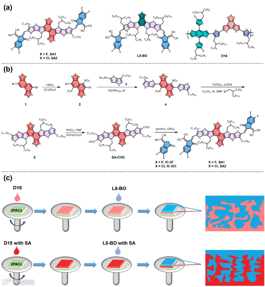 图1:(a)多功能固体添加剂、L8-BO和D18的化学结构。(b)多功能固体添加剂的合成路线。(c)活性层形成示意图