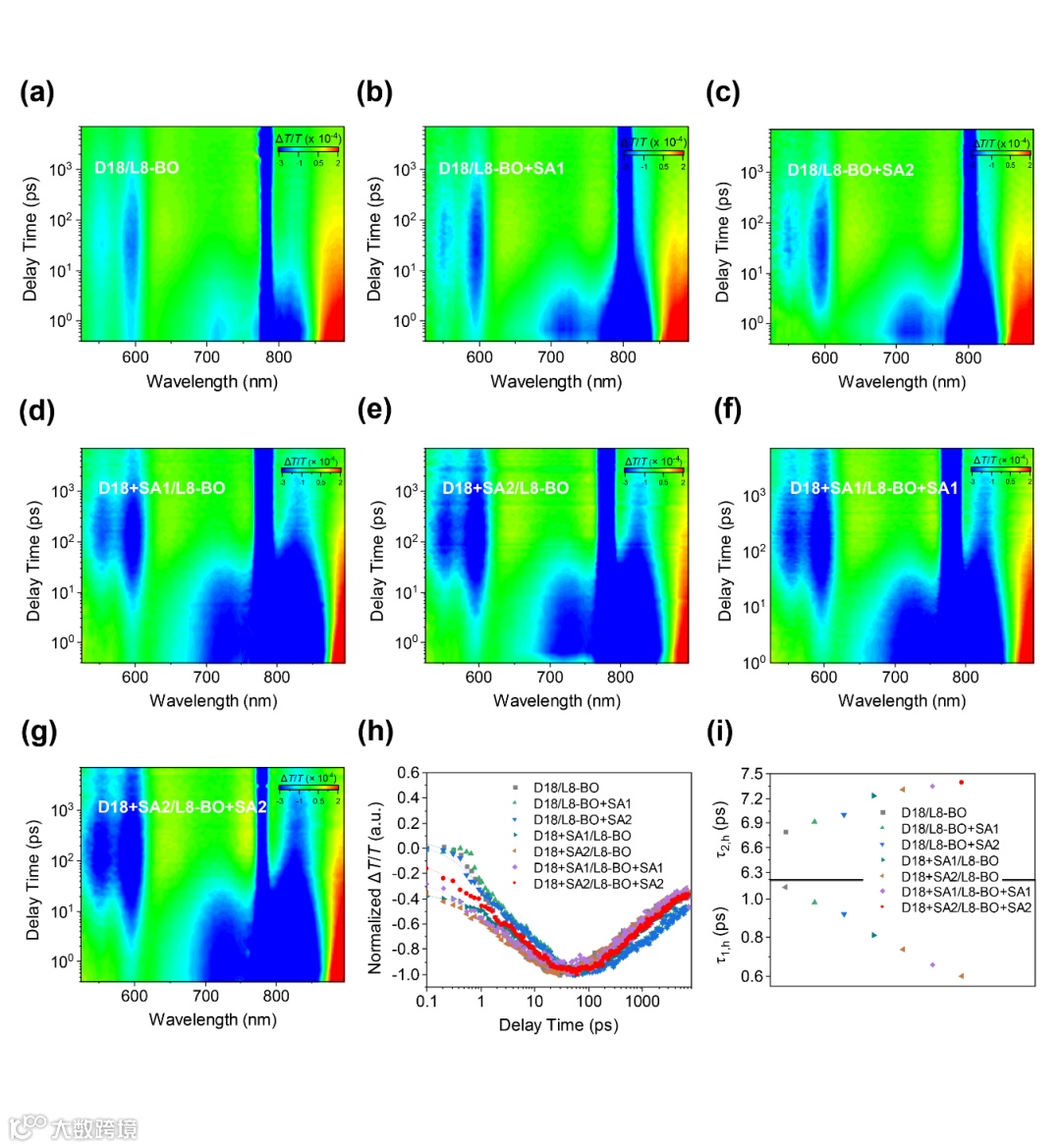 图3:(a-g)最佳共混膜的飞秒瞬态吸收光谱。(h)在600 nm处探测高性能共混膜的衰减动力学。(i)对共混膜的τ1,h和τ2,h进行了总结和比较。