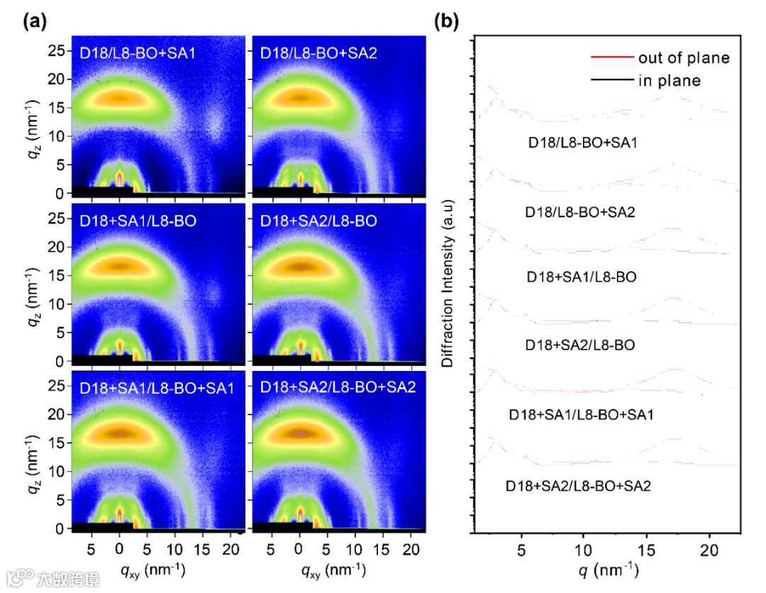 图4:(a)GIWAXS混合膜图像。(b)相应的平面外线切割(红线)和平面内线切割(黑线)以及从(a)开始。