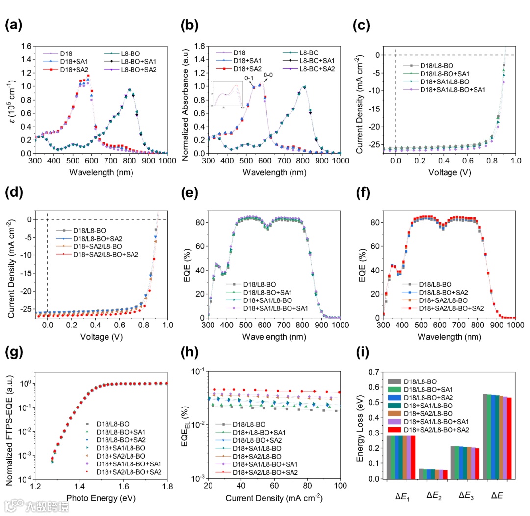 图2:(a)含或不含多功能固体添加剂的D18和L8-BO在固态薄膜中的紫外-可见-近红外吸收光谱。(b)D18和L8-BO在添加或不添加多功能固体添加剂的固态薄膜中的归一化紫外-可见-近红外吸收光谱。基于二元共混物的高性能器件的(c,d)J-V曲线和(e,f)EQE曲线。(g)PSCs器件的FTPS-EQE。(h)PSC的EQEEL曲线。(i)PSC的能量损失图。