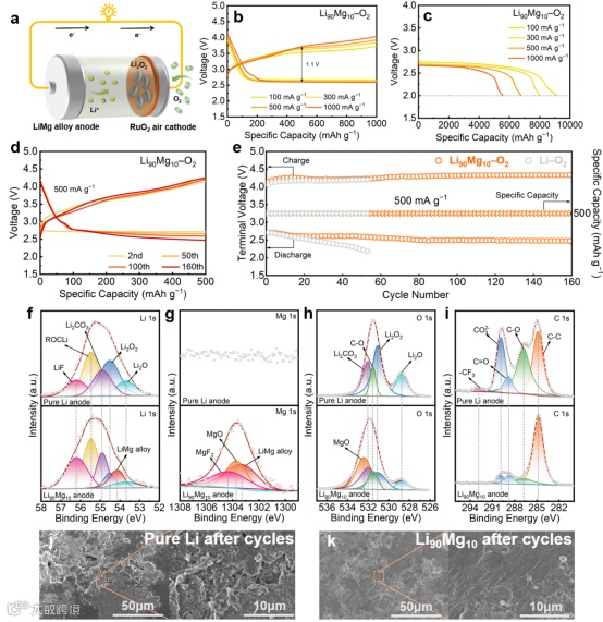 图5 a)Li90Mg10─O2电池结构示意图。b)Li90Mg10─O2电池在各种电流密度下的放电-充电曲线,截止容量为1000 mAh g-1。c)Li90Mg10─O2电池在不同电流密度下的恒流放电性能。d)Li90Mg10─O2电池在500 mA g-1和500 mAh g-1下的放电充电曲线。e)Li90Mg10─O2电池和Li─O2电池在500 mA g-1和500 mAh g-1下的循环性能。f–i)50次循环后纯锂和Li90Mg10负极的f)Li 1s、g)Mg 1s、h)O 1s 和 i)C 1s 的 XPS 光谱图。j)纯Li和k)Li90Mg10负极循环50次后的SEM图像。