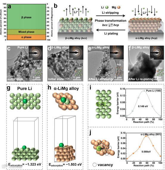 图1. a) 对应元素含量的相分布和 b) LiMg合金中锂剥离/嵌入引起的相变示意图。c) 纯锂, d) β-LiMg合金, e) 锂剥离后的β-LiMg合金, 以及 f) 镀锂后的β-LiMg合金的TEM图像。Li原子吸附到 g) 纯锂的(100)表面和 h) α-LiMg 合金的(001)表面上的模拟模型。i)纯Li和j)α-LiMg合金中锂原子扩散的迁移途径和相应的能垒。