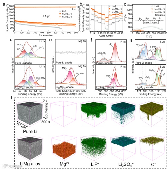 图4 a)Li─S、Li90Mg10─S和Li75Mg25─S电池在1 A g-1下的长循环性能。b)Li─S、Li90Mg10─S和Li75Mg25─S电池的倍率循环性能。c)Li─S、Li90Mg10─S和Li75Mg25─S电池在倍率循环后的EIS图。d-g)倍率循环后纯Li和Li90Mg10负极的d)Li 1s、e)Mg 1s、f)F 1s和g)S 2p的XPS光谱图。h)通过TOF-SIMS测量获得相关离子碎片的3D分布。